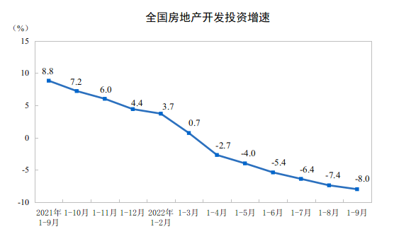 1—9月份,全國房地產(chǎn)開發(fā)投資103559億元,同比下降8.0%;其中,住宅投資78556億元,下降7.5%。