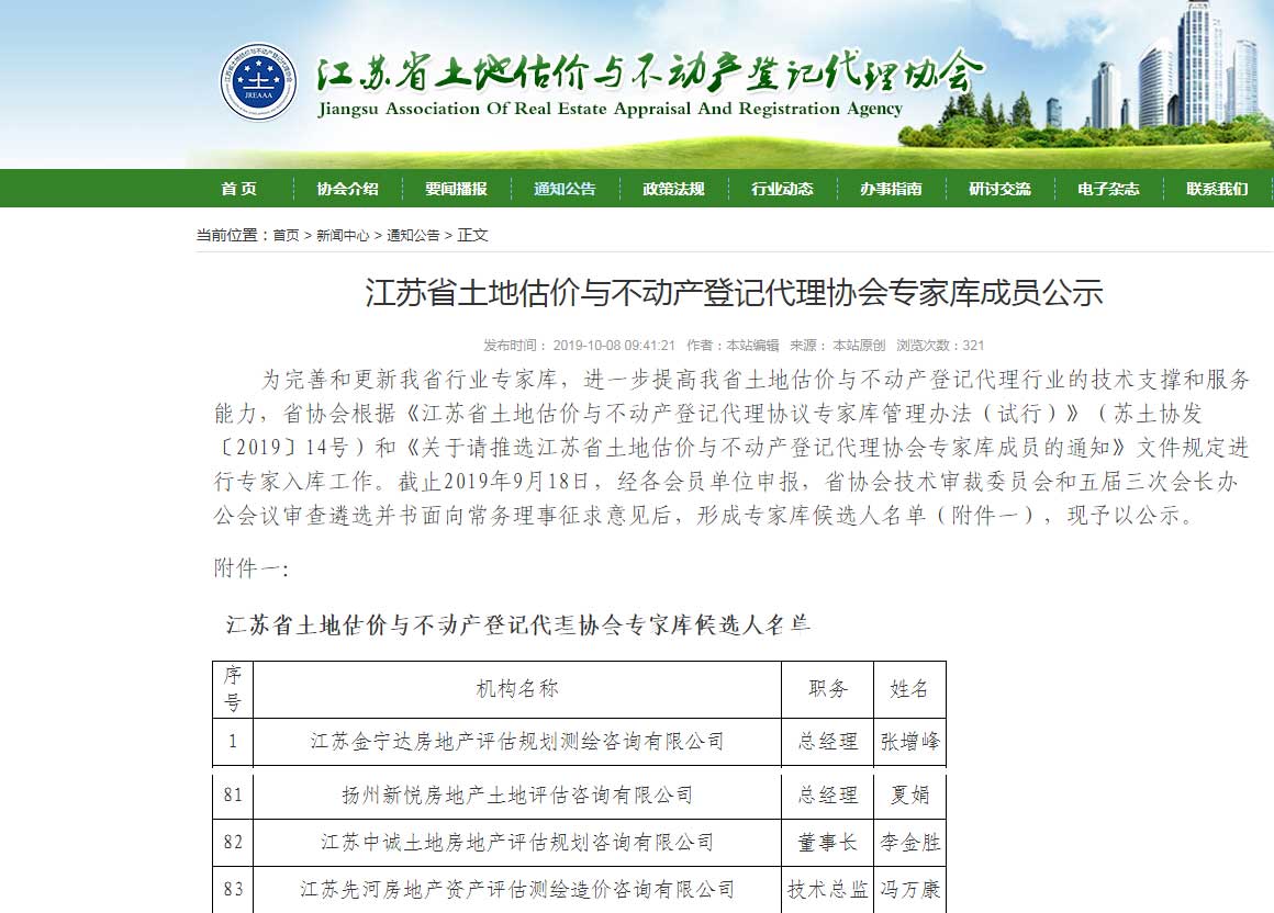 為完善和更新省行業(yè)專家?guī)欤f(xié)會(huì)根據(jù)《江蘇省土地估價(jià)與不動(dòng)產(chǎn)登記代理協(xié)議專家?guī)旃芾磙k法(試行)》(蘇土協(xié)發(fā)〔2019〕14號(hào))和《關(guān)于請(qǐng)推選江蘇省土地估價(jià)與不動(dòng)產(chǎn)登記代理協(xié)會(huì)專家?guī)斐蓡T的通知》文件規(guī)定進(jìn)行專家入庫(kù)工作。我公司董事長(zhǎng)李金勝入選江蘇省土地估價(jià)與不動(dòng)產(chǎn)登記代理協(xié)會(huì)專家?guī)斐蓡T。