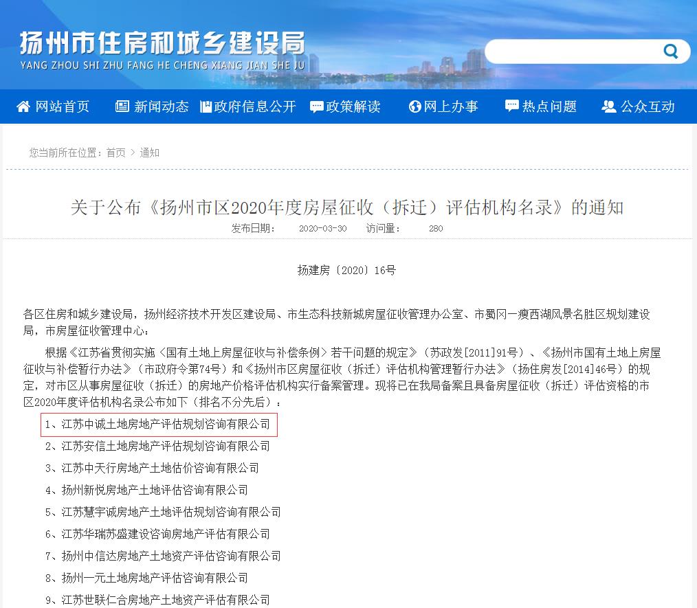我司入圍《揚州市區2020年度房屋征收(拆遷)評估機構名錄》